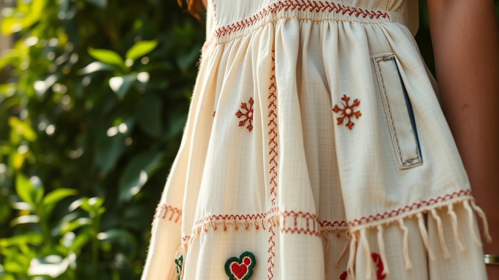 Adding embroidery and hand-stitch details is a simple way to elevate your boho fashion pieces with a personal touch. With DIY techniques, you can transform plain garments into unique, textured works of art. Use embroidery to add colorful floss or thread, creating floral, mandala, or ethnic motifs that reflect your style. Hand-stitching decorative borders or motifs on hems, necklines, or pockets instantly gives your diy clothes a handcrafted, eclectic vibe. Combining embroidery with fabric appliques or vintage textiles enhances the layered look typical of boho fashion. Even beginners can master basic stitches like running, satin, or French knots with simple tools like needles and hoops. These small, detailed touches make your clothes one-of-a-kind, showcasing your creativity and personal style. Additionally, incorporating traditional Cultural Celebrations motifs can add a meaningful and authentic touch to your designs. Practicing mindful organization of your supplies ensures your creative process remains enjoyable and efficient. Incorporating self-watering plant pots concepts such as organization and functional design can inspire innovative storage ideas for your craft supplies, keeping your workspace tidy and inspiring. Moreover, paying attention to interior elements in your craft space can enhance your overall creative environment.