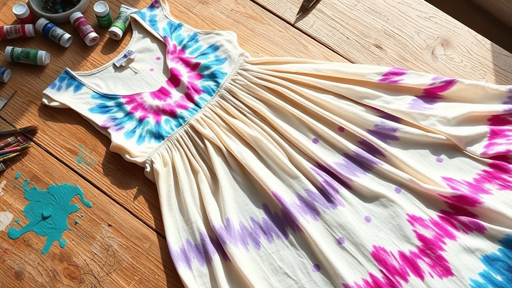 To achieve bold and lasting designs with your boho wardrobe, start by selecting high-quality fabric dyes or fabric paints that deliver vibrant, long-lasting colors. Once you have your supplies, gather essential materials like rubber bands, string, or fabric scraps to create interesting patterns. Pre-wash your clothing in cold water to remove finishes and dampen it for better dye absorption. When applying the dye, tightly secure sections of fabric with rubber bands or string to form striking shapes like spirals, stripes, or bullseyes. After dyeing, let your piece dry completely—preferably wrapped in plastic or paper—to set the colors and prevent smudging. Finally, wash your garment separately to preserve your unique boho design and enjoy your personalized, vibrant style.